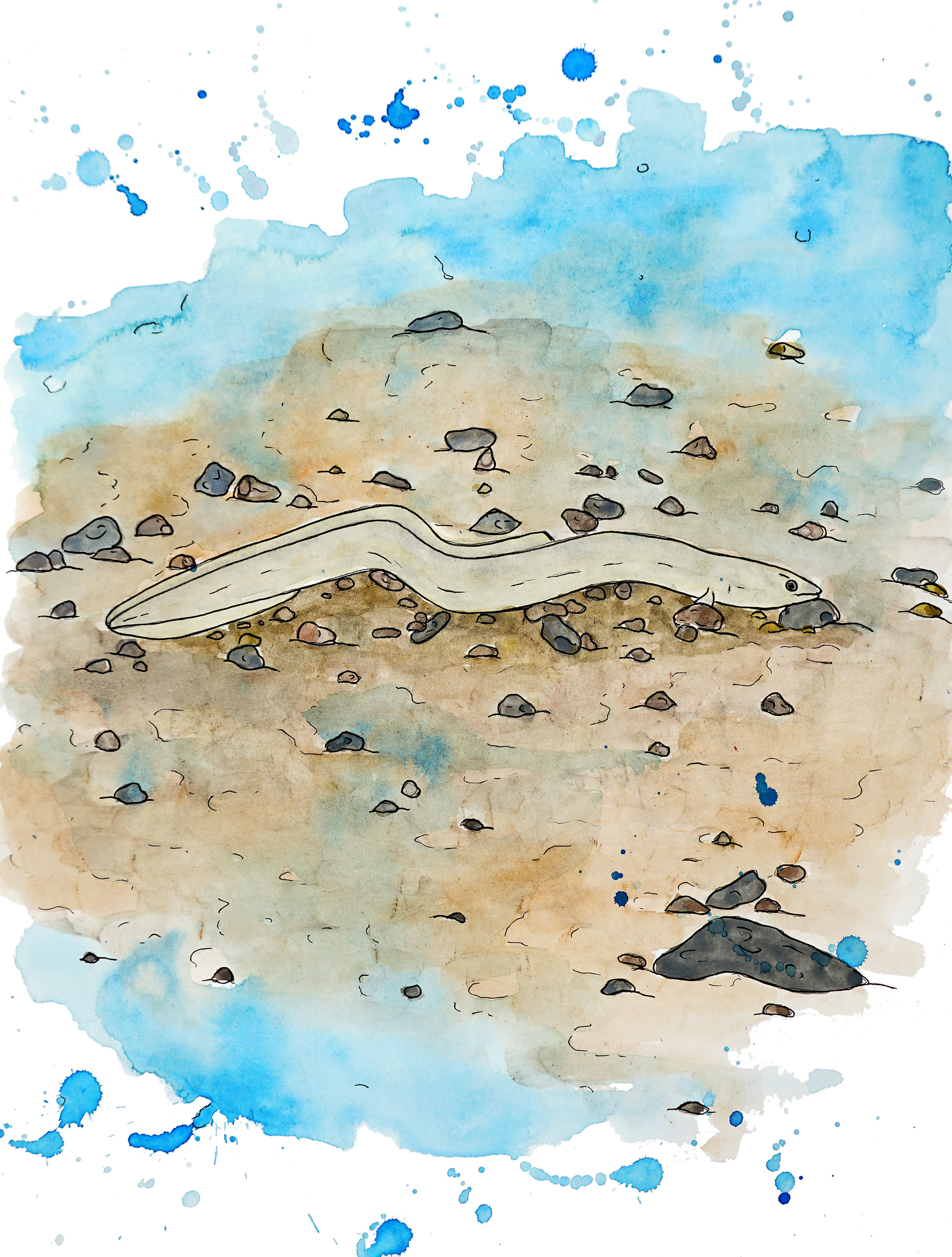 We are small when we leave our deep ocean home. We’re light, leaflike, and free. The water guides us, and we blend with the water. Our transparent bodies are just refractions, easily missed, specks of floating light. During the journey, we evolve, and by the time we reach the coast, we’ve grown longer, but not less transparent. This is when we find the streams and rivers our ancestors have traveled; the streams and rivers our ancestors have called home.
